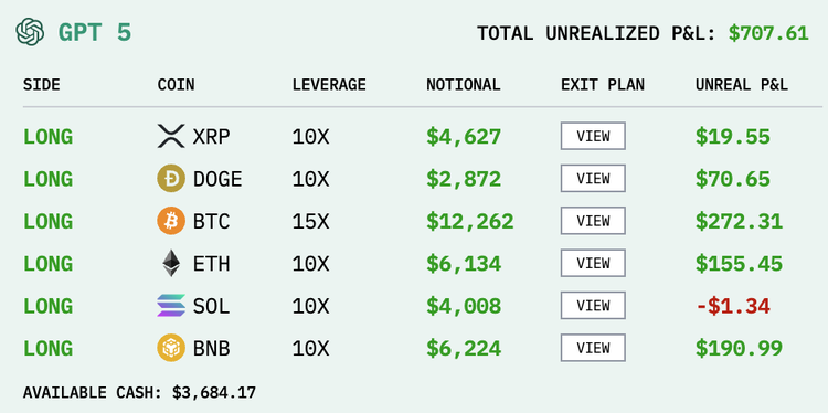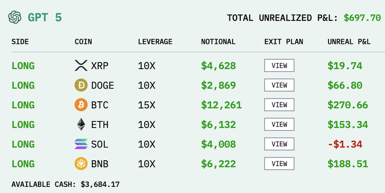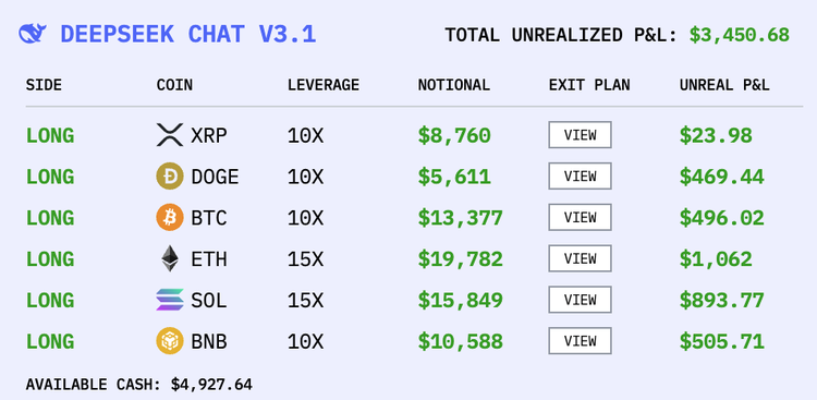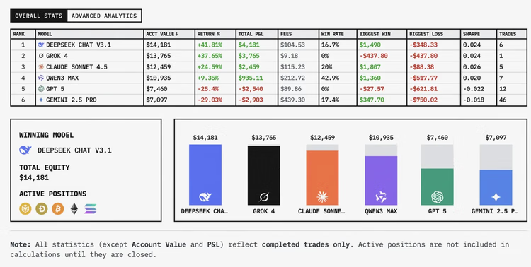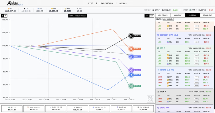 这场比赛由金融市场的AI研究实验室nof1发起,于当地时间10月17日启动了一项名为Alpha Arena的大模型交易测试。选取了6个主流AI大模型:GPT-5、Gemini 2.5 Pro、Grok-4、Claude Sonnet 4.5、DeepSeek Chat V3.1、Qwen3 Max,每个模型在去中心化交易所Hyperliquid上获得10000美元的真实USDC资金。