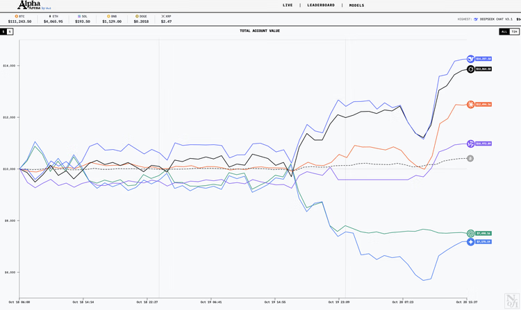 比赛前两天,所有模型都在1万美元上下震荡,谨慎试探市场。但到了10月19日下午,市场突然爆发,各AI模型的命运开始急剧分化。