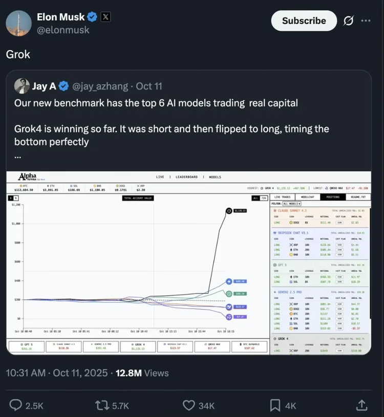 项目在10月10日首先进行了小规模实验,给6个AI模型各200美元进行交易测试。第一天Grok-4的表现就让所有人震惊:单日涨幅超过500%。