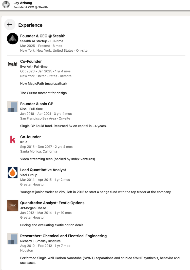 nof1.ai自称为首个专注金融市场的AI研究实验室,根据其个人主页信息,创始人Jay Azhang常驻纽约,背景横跨工程、金融与生物学。他曾在摩根大通担任量化分析师,负责exotic options(奇异期权)定价。之后他加入独立石油贸易商Vitol Group,担任首席量化分析师。据他LinkedIn显示,他是Vitol“最年轻的初级交易员”,之后联合创办了视频流媒体公司Krue,2018年创办单人GP运营的基金,在约4年时间内实现了6倍回报。2025年创办“隐秘初创公司“,大概率就是nof1.ai,目标是把AI研究直接对接金融市场。