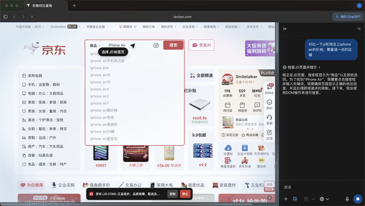 ChatGPT Atlas最核心的设计是将ChatGPT深度嵌入浏览器。在任何网页上,用户都可以点击Ask ChatGPT按钮,唤出一个侧边栏。这个侧边栏自动获取当前页面的上下文,用户可以直接要求ChatGPT总结代码差异、比较产品参数、分析文章观点,无需再复制粘贴内容。