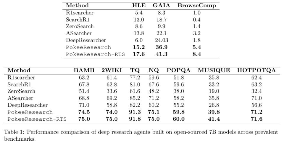 数据显示。PokeeResearch-7B的两个版本(带RTS和不带RTS)在所有10个基准测试中,平均准确率都超过了所有对手。