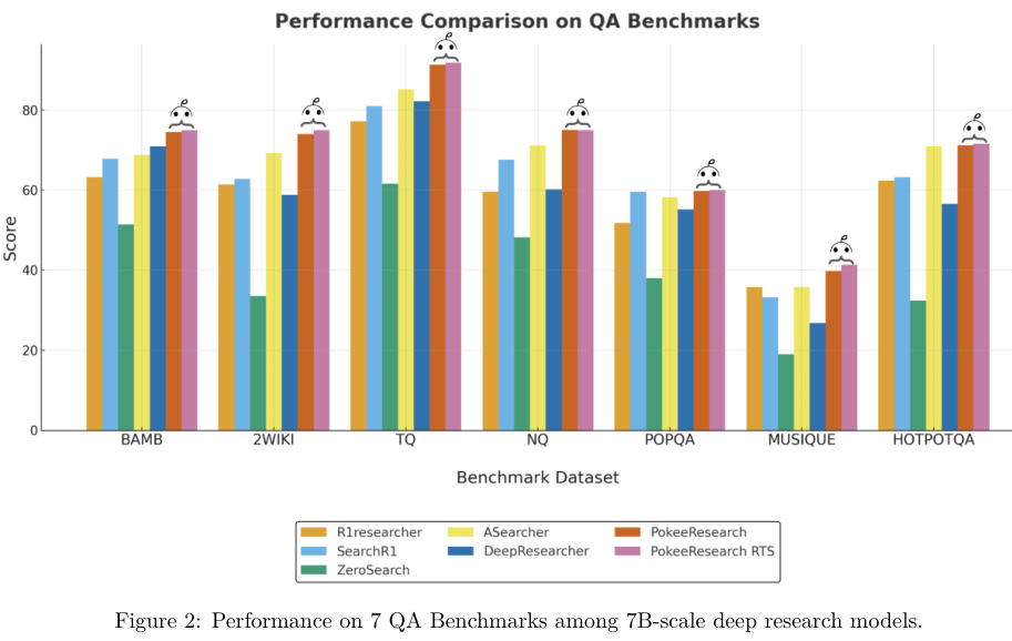 在10项基准测试中证明,所有参与比较的模型都基于同一个强大的开源模型Qwen2.5-7B-Instruct,在70亿参数规模的深度研究智能体中,PokeeResearch-7B展现出了最先进的性能。