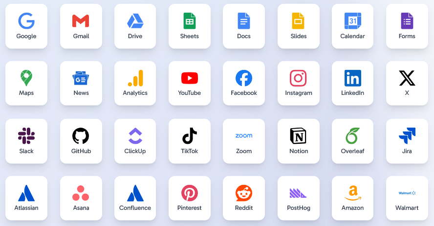 公司的平台已经集成了市面上你能想到的大部分主流应用。从谷歌全家桶(Gmail、Drive、Sheets等),到社交媒体(Facebook、LinkedIn、X、TikTok),再到协作工具(Slack、GitHub、Jira、Notion),甚至电商平台(亚马逊、沃尔玛),它都能连接。