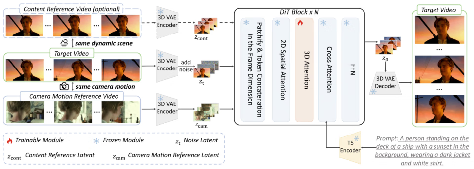 随后,这些条件 Tokens 与需要去噪的目标视频的噪声 Tokens,在时间维度(Frame Dimension)上进行直接拼接。拼接后的序列被送入 Diffusion Transformer 中进行处理。这种设计使得模型可以通过注意力机制来学习如何利用来自参考视频的相机运动线索和内容信息,从而指导视频的生成。