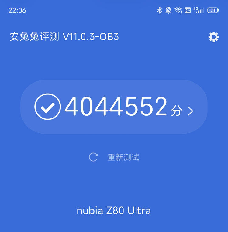 我们用安兔兔在室温环境下对 Z80 Ultra 进行测试,它轻松的跑出了 404W 分的成绩,对于一款非电竞手机来说,这是非常难得的亮眼数据。