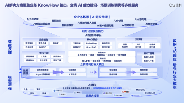 以北京一财产险公司合作为例,众安信科提供的是从战略到落地的全链路AI体系建设服务,涵盖顶层AI规划、底层模型选型与路由策略、精细化算力优化,到中层AI中台的搭建,最终在上层落地赋能一线业务的智能体应用。