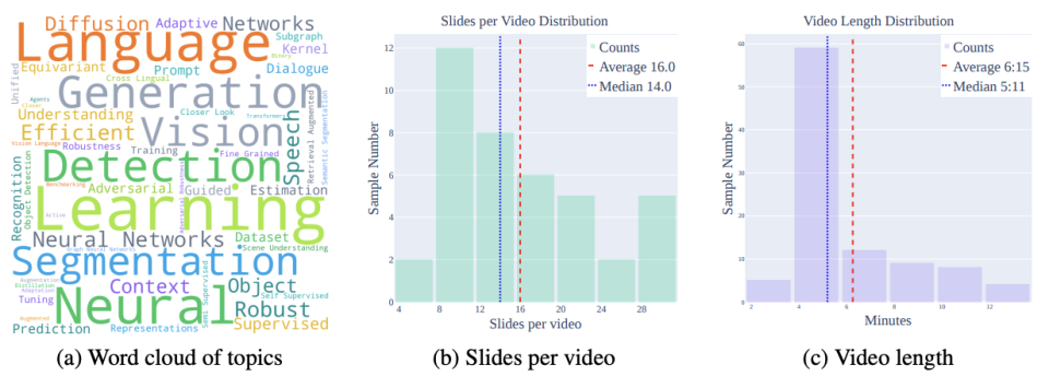 Paper2Video 基准收集了来自近三年顶会的 101 篇论文及其作者录制的展示视频,涵盖机器学习、计算机视觉与自然语言处理领域。每个样例包含论文 LaTeX 工程、幻灯片、展示视频、讲者肖像与语音样本,其中部分还提供原始 PDF 幻灯片。数据统计显示,论文平均 13.3K 字、44.7 幅图表,展示视频平均 16 页幻灯片、时长 6 分钟。