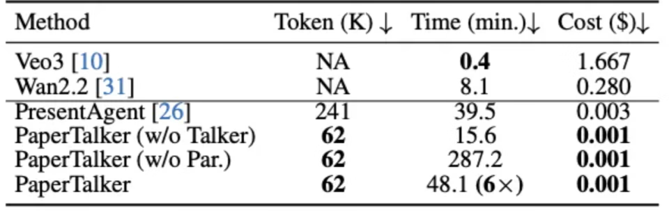 PaperTalker 在生成成本上最低。其效率主要来自三个方面:(i) 基于 Beamer 的幻灯片生成显著减少了 token 消耗;(ii) 引入轻量化的 tree search visual choice 作为幻灯片的后处理;(iii) 采用并行的 talking-head 生成机制缩短了整体运行时间。相比之下,PresentAgent 由于在幻灯片编辑过程中频繁依赖大模型查询,导致成本更高。