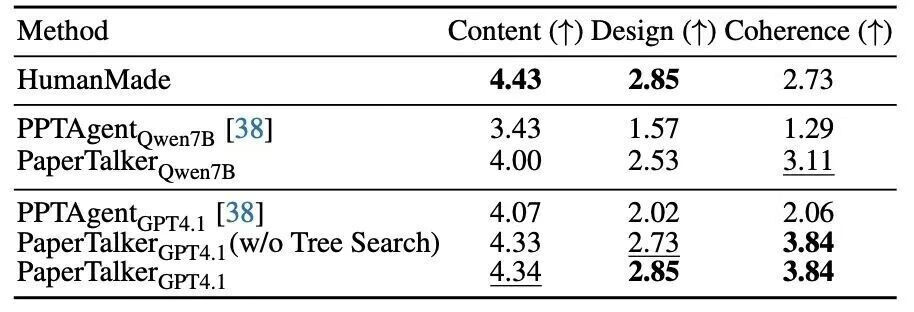 PaperTalker 在幻灯片、字幕和语音的相似度上均取得最高分,说明其生成结果与人类作品最为接近。