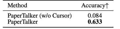 光标提示通过提供显式空间线索,帮助观众和 VLM 更好地定位幻灯片中的关键信息。为验证这一点,本文设计了定位问答任务,比较有无光标情况下的答题准确率。结果显示,带光标的视频准确率显著更高,证明了光标在增强学术展示视频的视觉定位与内容可达性方面的重要作用。