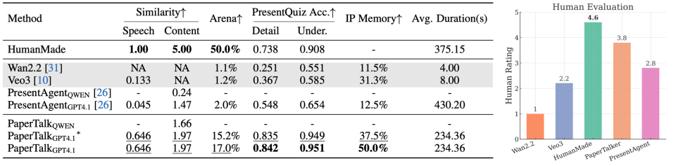 人类评价结果显示,人类录制视频得分最高,PaperTalker 次之,且显著优于其他方法,接近人类水平。