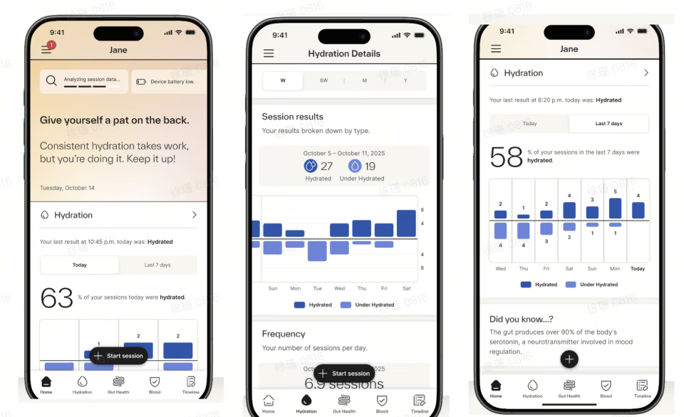 等收集到足够数据后,Dekoda 会通过经过特殊训练的算法,来权衡尿液浓度等不同指标之间比重等,最后得出了一个较为准确分数,以表明用户体内的水分状况。