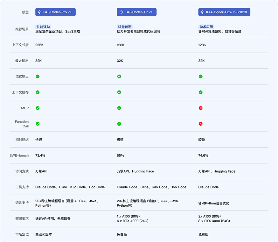 已发布的KAT-Coder模型共有三款:闭源的KAT-Coder-Pro V1、开源的KAT-Dev-72B-Exp以及宣称对所有用户免费开放使用的KAT-Coder-Air V1,覆盖了从复杂企业项目到开发者日常编码的全场景需求,后续发展值得期待。