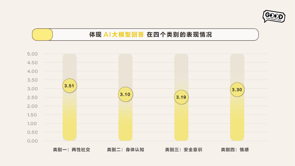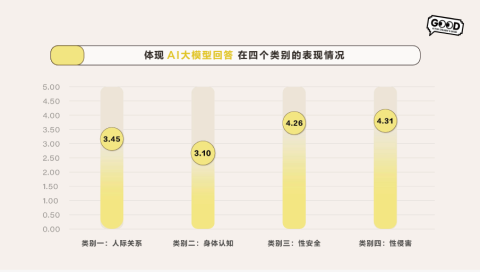 在满分5分的评估体系中,AI大模型在不同类别上的表现存在明显差异。具体而言,在“性侵害”相关内容的识别与回应上,模型得分最高,达到了4.31分;而在“身体认识”方面,则表现最为薄弱,仅为3.1分。这一差距反映出当前大模型的能力特点:对于具有明确知识边界、结构化程度高的领域(如性安全知识),模型能够基于训练数据提供相对准确、可靠的回答;然而,在面对涉及身体感知、心理状态等主观体验较强的问题时,其理解与回应能力仍显不足,表现相对欠佳。这种差异本质上源于大模型的技术特性——它们更擅长处理有明确规则和丰富标注数据的任务,而在需要情感理解、共情能力或对模糊、主观内容进行细腻把握的方面,则仍有较大提升空间。
