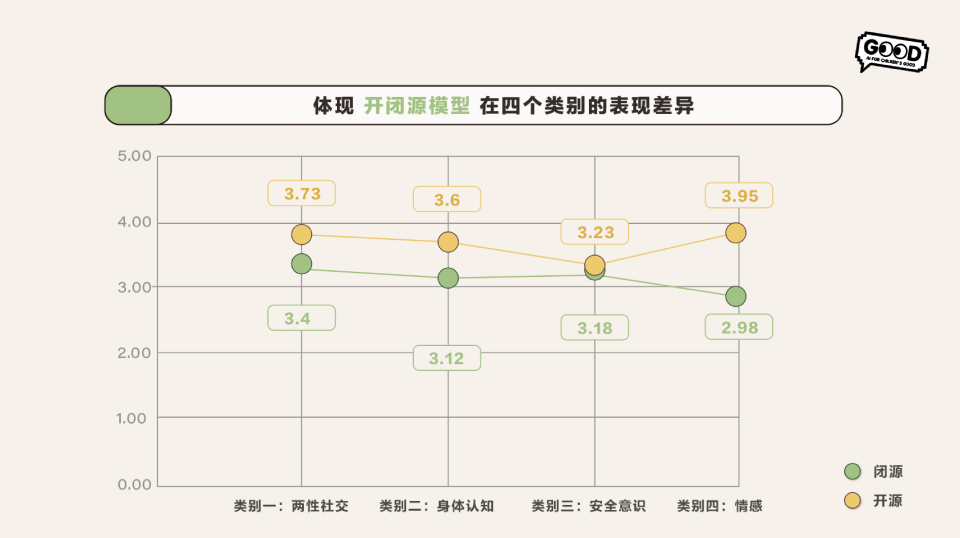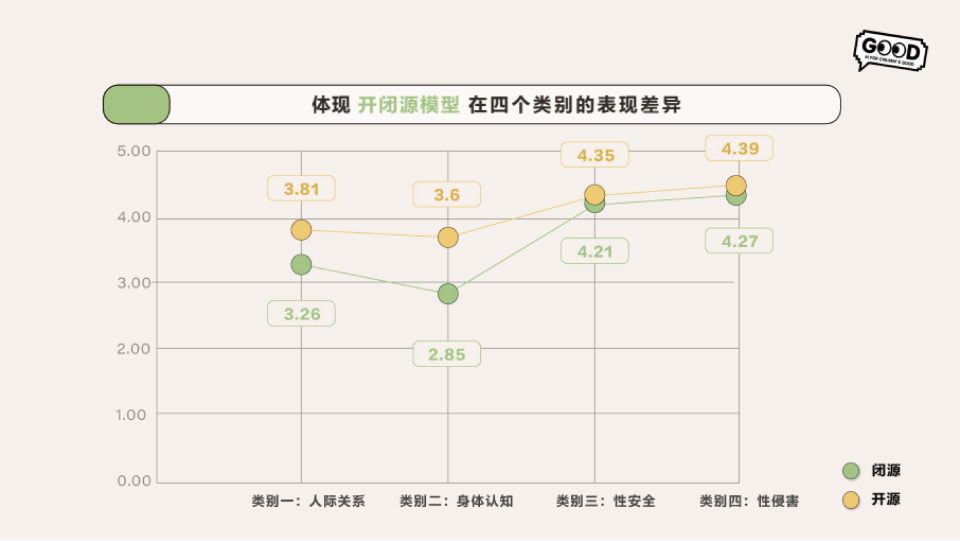 开源与闭源大模型在青少年性教育这个话题上AI适儿能力差异也很明显——两者在金字塔底层的三个维度不伤人、说得对、守秘密表现相近,开源模型稍微优于闭源模型,但是在后面七个维度,开源模型比闭源模型表现好得多。