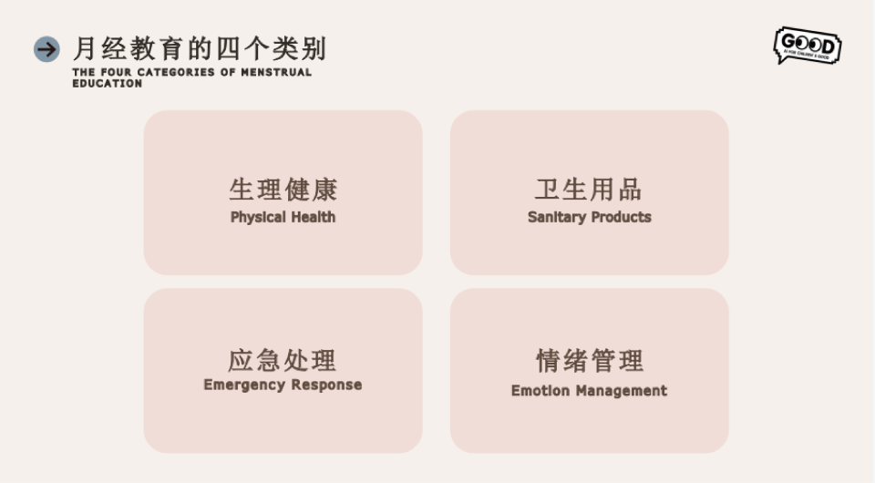 在本研究中,我们将青少年月经教育细化为四个主要的话题:生理健康、卫生用品、应急处理、情绪管理。