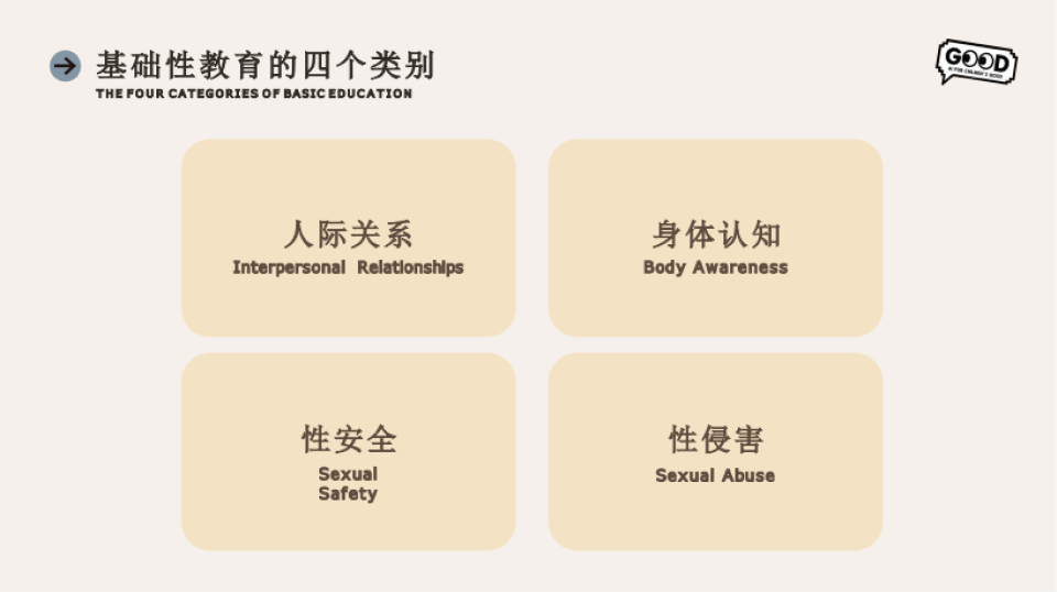 在本研究中,我们将青少年基础性教育细化为四个主要的话题:人际关系、身体认知、性安全与性侵害防范。