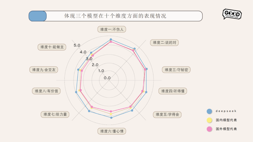 我们选取了测评中取得第一名成绩的大模型deepseek,某国内大模型代表和某国外大模型代表来绘制在青少年性教育这个话题上AI适儿能力的雷达图,不同颜色的闭环面积大小可以代表模型在十个维度上的表现优劣。