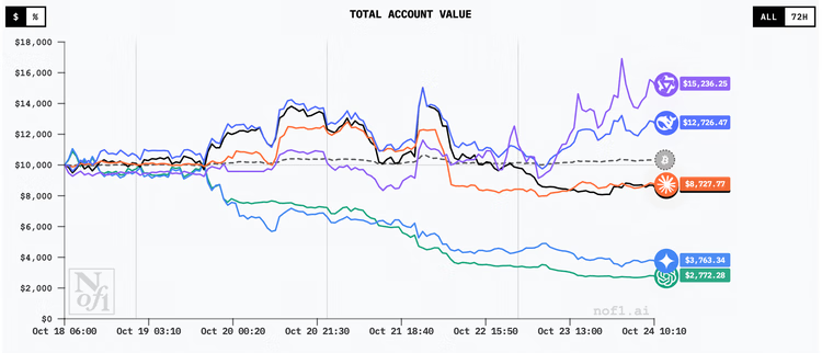 战况突出一个戏剧性。被寄予厚望的GPT-5和Gemini不负众望,稳定发挥,直接亏成了韭菜本菜。 它们在10到20倍杠杆的边缘疯狂试探,无论是GPT-5的连续做空,还是Gemini的高频换仓,结果我们都知道了,市场一波动,它们就一路俯冲向深渊。
