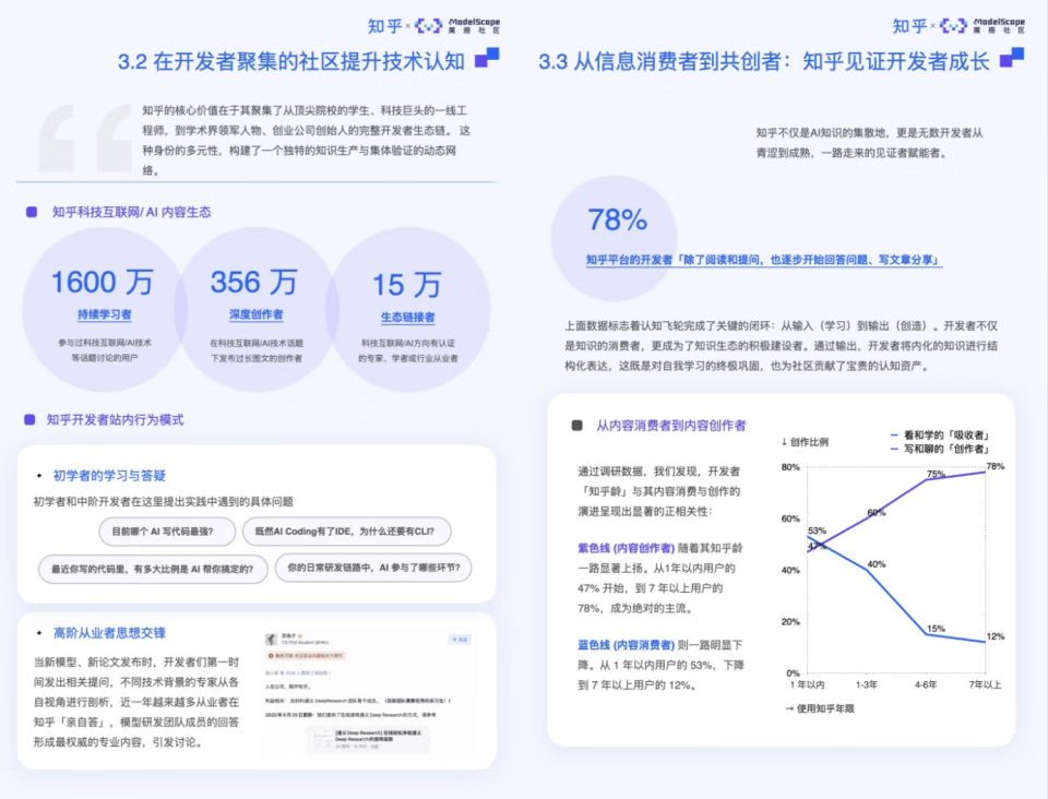 面对永无止境的学习曲线,开发者的信息获取路径分为四步:感知、溯源、消化、应用 。当一个新技术(如新模型)发布,他们的首选是去官网和论文获取一手信源 ;而下一步「消化阶段」——即「这东西到底怎么理解?」——他们则涌向了知乎和其它垂直技术社区 。
