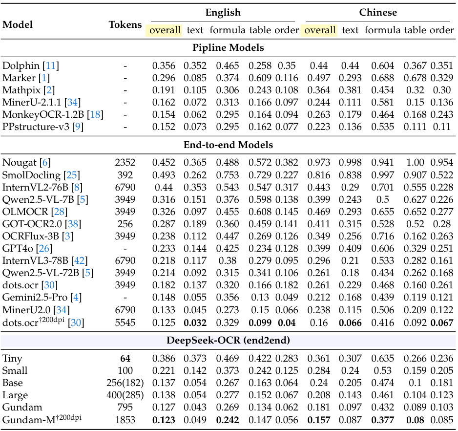从这张密密麻麻的表里能看出,DeepSeek-OCR只用100个视觉token(Small模式),就超过了用256个token的GOT-OCR2.0。用不到800个token的Gundam模式,更是把需要近7000个token的MinerU2.0甩在身后。这说明DeepSeek-OCR的token效率极高,用更少的资源干了更多的活。