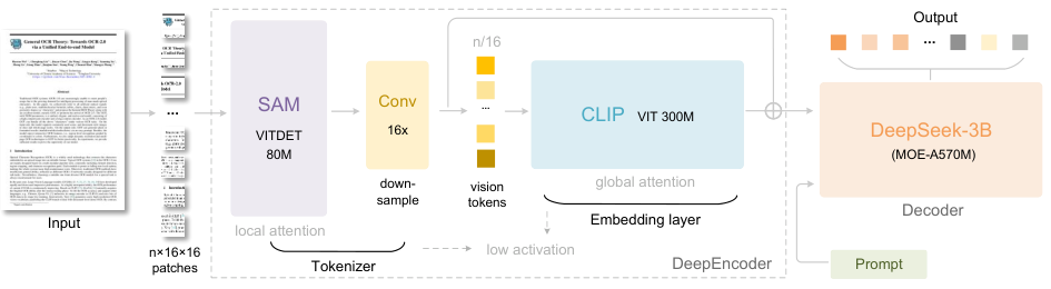 它的核心武器是一个叫DeepEncoder的编码器,参数量大约3.8亿。这编码器是把两个业界大神SAM-base(8000万参数)和CLIP-large(3亿参数)给串联了起来。可以把它想象成一个两级流水线。