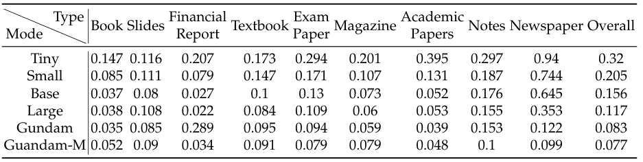 你看,像幻灯片这种格式简单的,64个token的Tiny模式就够用了。书籍和报告,100个token的Small模式也表现不错。