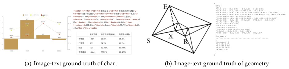 主要包括图表、化学公式、平面几何图形的解析。图表数据,他们用程序生成了1000万张,把图表解析定义成一个“看图说话”的任务,直接输出HTML格式的表格。化学公式,利用公开的化学数据库生成了500万张图片。平面几何图形也生成了100万张,还特意做了数据增强,把同一个几何图形在画面里挪来挪去,让模型明白,位置变了,但图形本身没变。