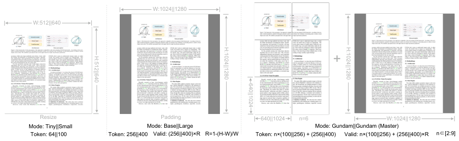原生分辨率模式下,有四个档位:Tiny(512×512,64个token)、Small(640×640,100个token)、Base(1024×1024,256个token)和Large(1280×1280,400个token)。小图就直接缩放,大图为了保持长宽比会进行填充,保证图像信息不失真。