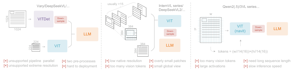 在DeepSeek-OCR之前,业界在怎么让模型“看”图这件事上,已经摸索了很久,主流的视觉语言模型(VLMs)里,视觉编码器大概有三种玩法,但家家有本难念的经。