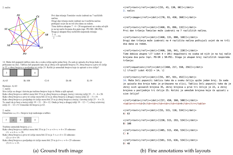 为了让模型学得更扎实,他们准备了两种“教材”:粗糙版的和精细版的。粗糙版就是直接从PDF里提取文字,教模型认识光学文本。精细版则动用了更高级的布局分析模型和OCR模型来做标注,告诉模型哪里是标题、哪里是段落,文字和检测框怎么对应。