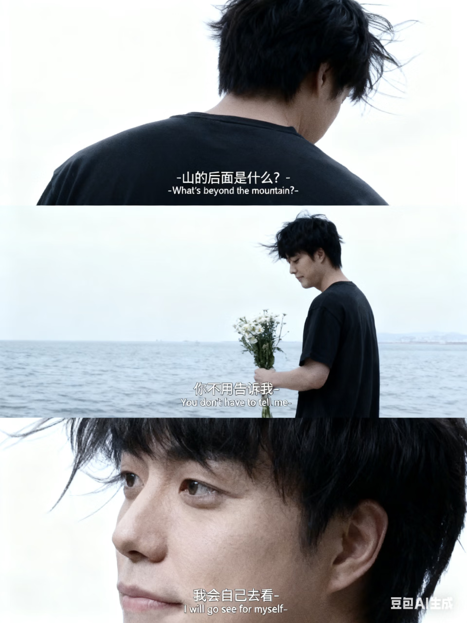 将图片编辑为三宫格胶片质感艺术感写真。场景为海边沙滩、天空、傍晚,人物和脸不变。第一张为近景,上半身背影,风吹起头发,发丝凌乱,添加中英字幕“山的后面是什么?-What's beyond the mountain?-”;第二张为中景,人物手持一束花束,侧身站立于海边,看向手中的花,风吹起头发,发丝凌乱,添加中英字幕“你不用告诉我-You don't have to tell me-”;第三张为大特写,人物脸部位于画面偏左侧,风吹起头发,发丝凌乱,添加中英字幕“我会自己去看-I will go see for myself-”。整体色调清冷,带有富士胶片效果,过度曝光,画面粗粝且色调偏冷,暗部细节保留完整,高光区域呈现自然化、柔和漫射光,无明显硬边阴影,营造出文艺且充满自我探索情绪的氛围,字幕位于底部居中,三宫格合成一张图。比例3:4。