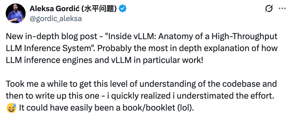 一篇超长的硬核博客文章:《Inside vLLM: Anatomy of a High-Throughput LLM Inference System》针对 vLLM 的架构、代码和原理进行了深入的分析,这可能是关于 LLM 推理引擎和 vLLM 工作原理的最深入解读。