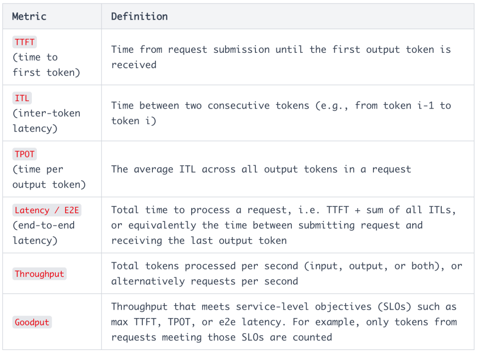 在解释为什么延迟和吞吐量存在竞争关系之前,我们先定义一些常见的推理性能指标: