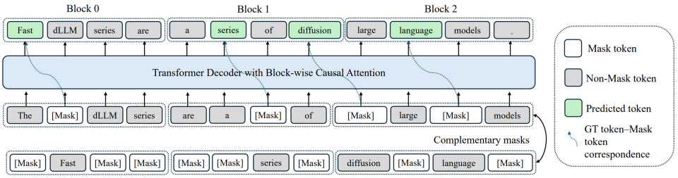 Fast-dLLM v2 按固定块大小把序列切成若干块:块内双向注意力以并行去噪,块间保持左到右的因果关系,从而既能并行、又能沿用 AR 的语义组织、可变长度和 KV Cache;配合互补掩码(complementary masking)与 token-shift,保证每个 token 都在 “可见 / 被遮” 两种视角下学习,稳定恢复 AR 语义表征。