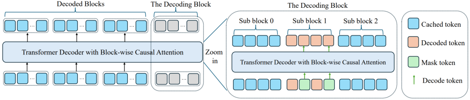 块级缓存:已解码块的 KV 直接复用,天然支持 KV Cache。