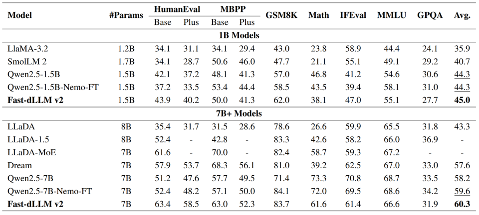 7B:平均分 60.3,超过 Qwen2.5-7B-Nemo-FT(59.6) 和 Dream(57.6);多数单项基准上持平或更好。评测覆盖 HumanEval/MBPP、GSM8K/MATH、MMLU/GPQA、IFEval 等多项基准。