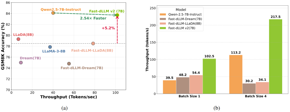 7B 规模吞吐与精度:在 A100 上,Fast-dLLM v2(7B)吞吐为 Qwen2.5-7B-Instruct 的 2.54×;同时对比 Fast-dLLM-LLaDA 还有 +5.2% 的准确率提升(GSM8K)。