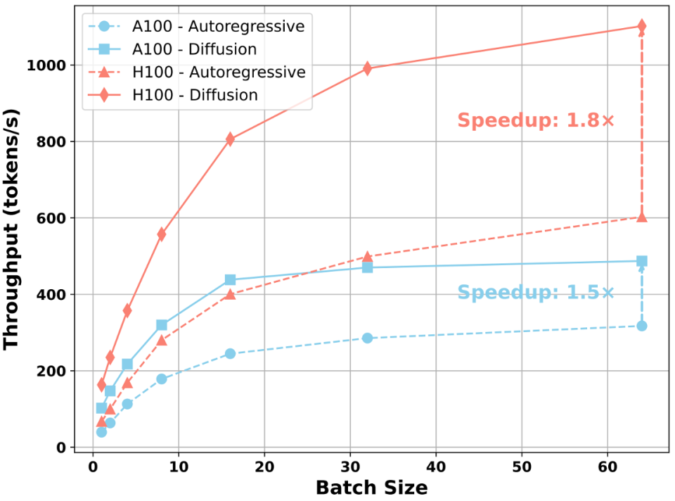 Batch / 硬件可扩展性:在 A100/H100 上随 batch 增大,扩散解码的并行优势更明显;A100 上可达~1.5× 吞吐加速,H100 上最高可达~1.8× 加速。