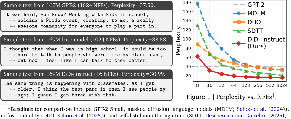 研究团队在公开的 OpenWebText 数据集上进行了详尽的实验,结果出人意料:经过 DiDi-Instruct 后训练的语言模型在效率和效果上得到了双重提升。