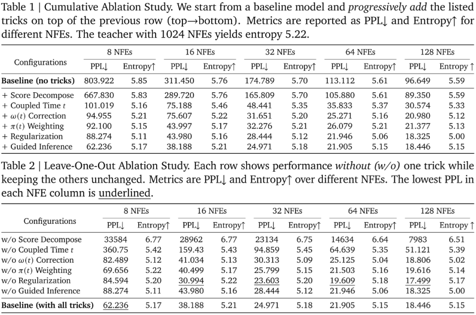 时间步耦合能高效提升蒸馏性能:该技术将 8 步生成下的困惑度从 600 + 骤降至 100 左右,凸显了对齐奖励信号与分数函数中间状态的重要性。而在目标函数中增加权重信息则能进一步提升模型训练效果。