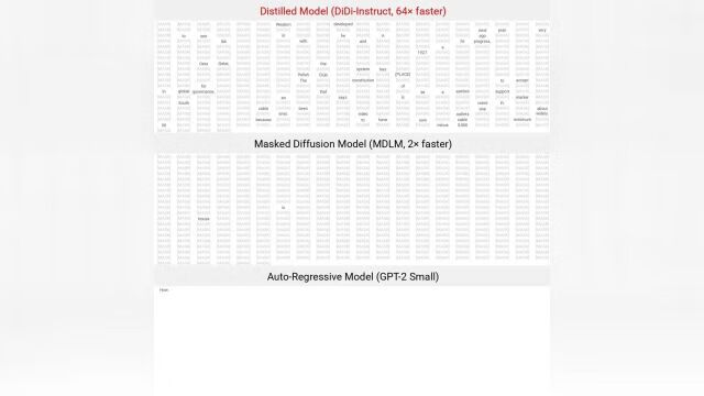 近年来,以自回归(ARMs)范式为核心的大语言模型(如 ChatGPT,DeepSeek 等模型)取得了巨大成功。然而,自回归模型逐词串行生成的固有瓶颈,使其在长文本生成时面临难以逾越的延迟 “天花板”,即使强大的并行计算硬件也无计可施 。作为一种新兴的替代范式,扩散语言模型(后文将用 dLLM 指代)应运而生。dLLM 将文本生成重塑为一个从完全噪声(或掩码)序列中迭代去噪、恢复出完整文本的过程 。这一模式天然支持并行化语言段落生成,相较于自回归模型生成速度更快。然而尽管如此,现有最好的 dLLM 在同等模型尺寸下为了达到与 GPT-2 相当的性能,仍然需要多达上百次模型迭代。这个困境不禁让人疑惑:是否存在模型在极端少的迭代次数下(如 8-16 次迭代)下能显著超越 1024 次迭代的 GPT 模型?