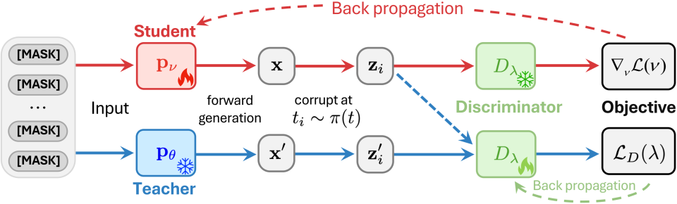 DiDi-Instruct 流程示意:学生模型(Student)与教师模型(Teacher)从全掩码序列重建 “干净文本”,并同时进行加噪处理。随后,判别器(Discriminator)对两者输出进行区分并给出奖励分数,用作学生模型的更新信号,使其在后续生成中逼近教师分布。经过反复迭代,Student 能以更少步数获得接近 Teacher 的生成质量。