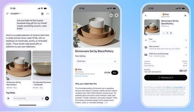 9月29日,ChatGPT上线Instant Checkout(即时结账)功能,首批接入美国手工艺品电商平台Etsy,以及全球最大电商独立站平台Shopify。用户无需跳转至第三方平台,在ChatGPT内部即可完成购物。
