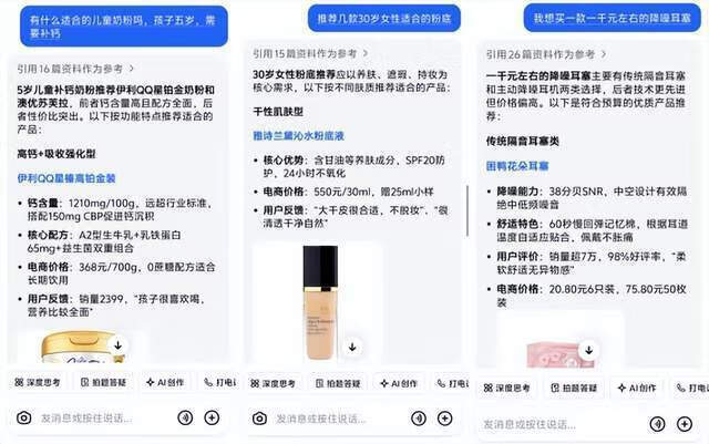 国内互联网公司中,淘宝8月下旬开始测试“AI万能搜”,用户提问后,淘宝会推荐购买攻略、商品口碑、优惠信息等。今年双11期间,淘天一口气推出六款AI导购应用,包括“AI万能搜”“AI帮我挑”“拍立淘”等,覆盖众多购物场景。