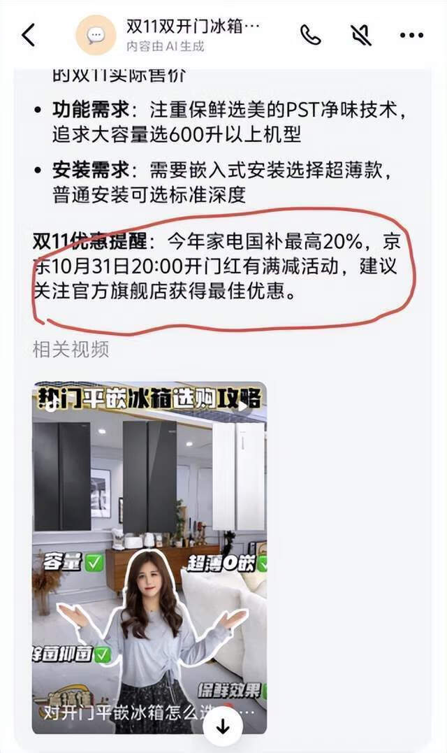 此外,豆包还给出了不同预算区间的选购建议,并在双11优惠提醒中特别提到,今年家电国补最高20%。它还配上了抖音的一则“热门平嵌冰箱选购攻略”短视频。