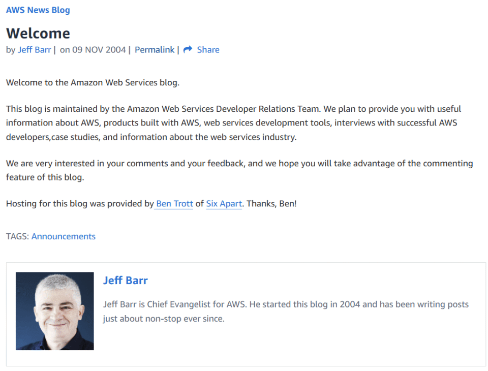 这个充满亚马逊风格的决策,最终开启了一个全新的营销门类。Jeff Barr 的博客(AWS News Blog)正式上线,他以第一人称的开发者视角,亲自测试、撰写代码,发布了 S3、EC2 等早期服务。