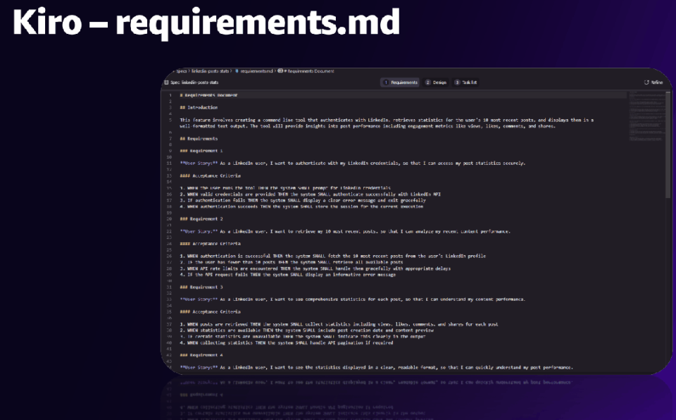 生成规范:Kiro 会与开发者来回对话,将模糊的想法扩展为一份详细的、包含验收标准 (Acceptance Criteria) 的技术规范。