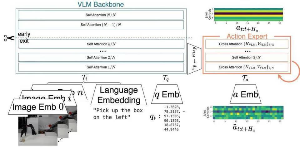 教程重点介绍了两种前沿的 VLA 模型:π₀ 和 SmolVLA。这两者均采用了混合专家(MoE)架构,将预训练的 VLM 作为强大的「感知主干」,负责理解视觉和语言指令,再结合一个专门的「动作专家」来生成精确的机器人控制指令。